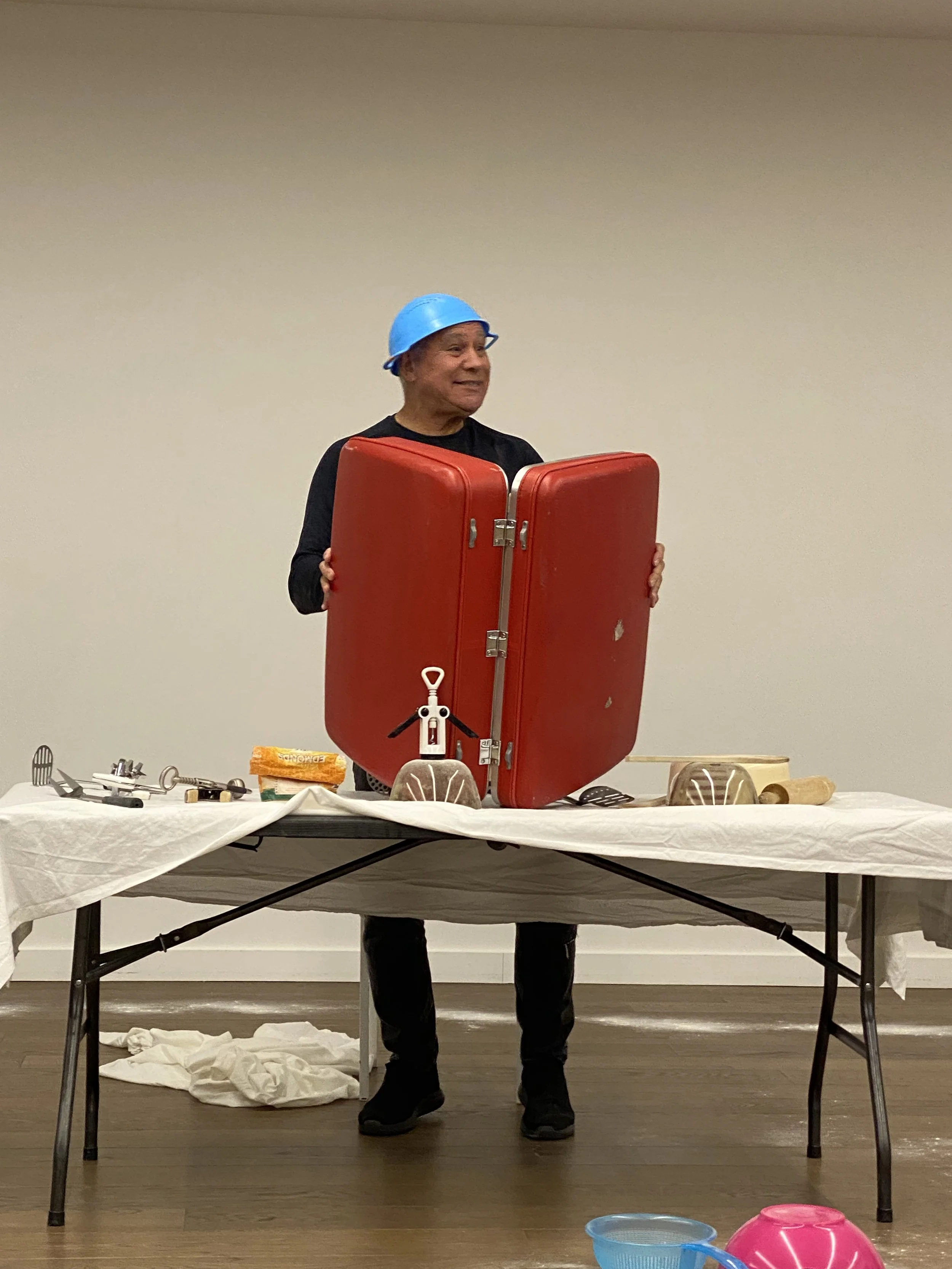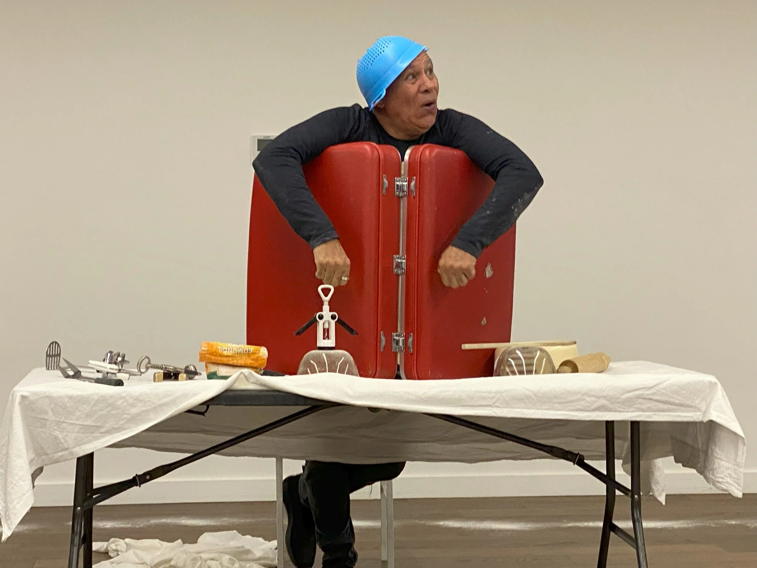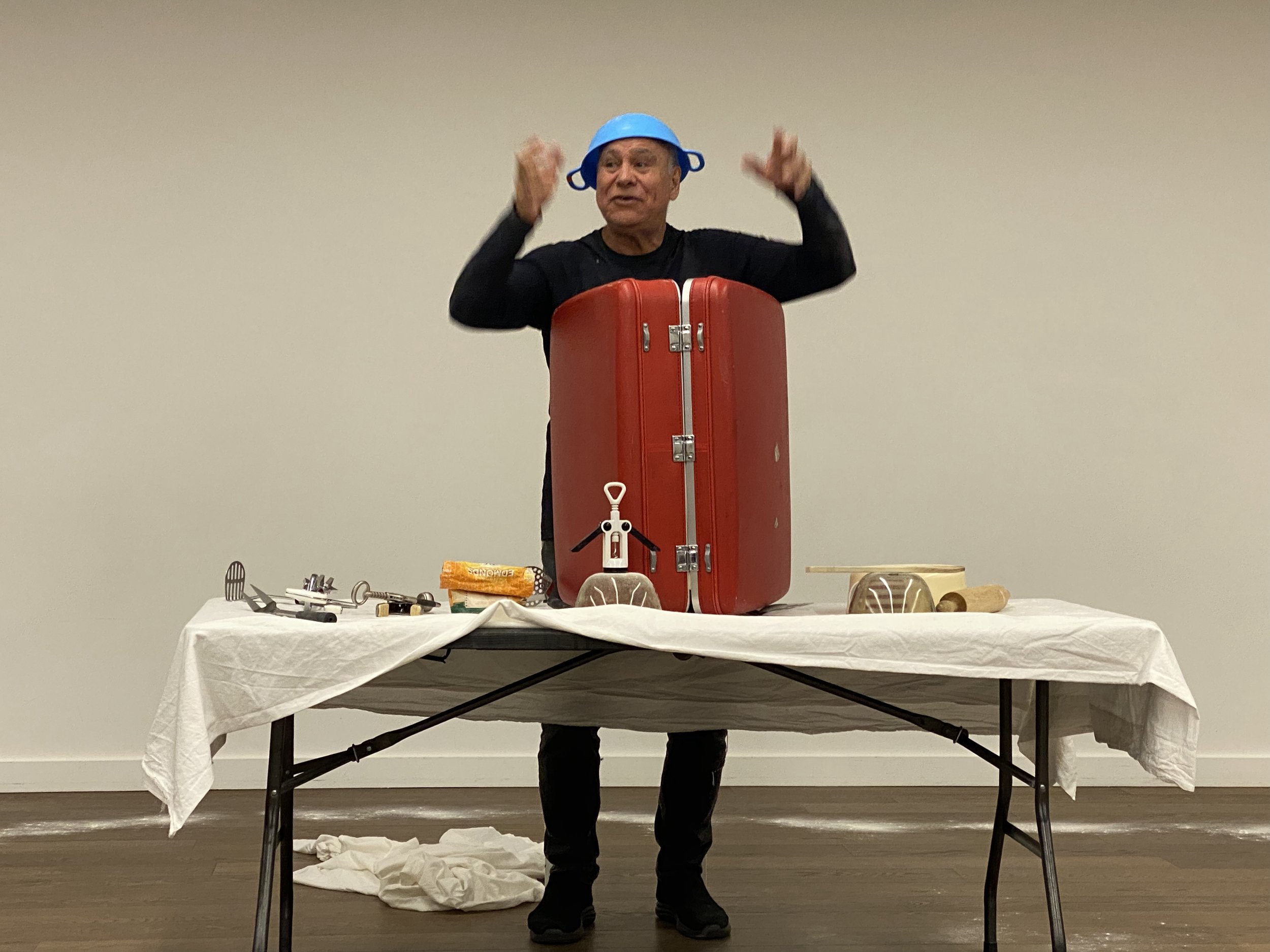 We pared everything back. The show fits into a suitcase, requires a table, three chairs, a hat, and a scarf. It can be performed in a community venue, a theatre, or a local hall.